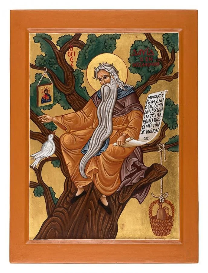 We read in this week’s Gospel lesson of Jesus’s encounter with Zacchaeus, up in the sycamore tree. This fellow perched in a tree is not, in fact, Zacchaeus, but St David the Dendrite. The Dendrites were a class of hermit who took Jesus’s instructions to “consider the birds of the air” perhaps a bit too literally, taking up residence in the branches of trees as a form of withdrawal from the world. Like Zacchaeus, they climbed up into a tree to get a glimpse of Jesus — we see St David’s little icon of Christ up there in the tree with them. Unlike Zacchaeus, however, they didn’t hear Jesus calling them to come back down.